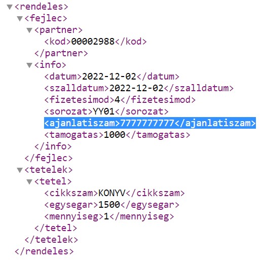 Amennyiben a rendelés WEB-ről érkezik, a NEPTUN kódot a kapott XML fájlban az <info> blokkban kell <ajanlatiszam> címkével átadni.