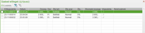 Lezárás, nyomtatás (F4) után kiválasztható a felhasználható előleg: