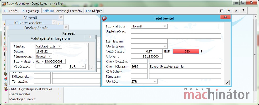 Az ott megadott főkönyvi számra lesz kontírozva az a pénztár és valutapénztár bizonylat, amelyben az átvett forintértékét kivezeti a program a valutapénztárból és átteszi a forintpénztárba.
