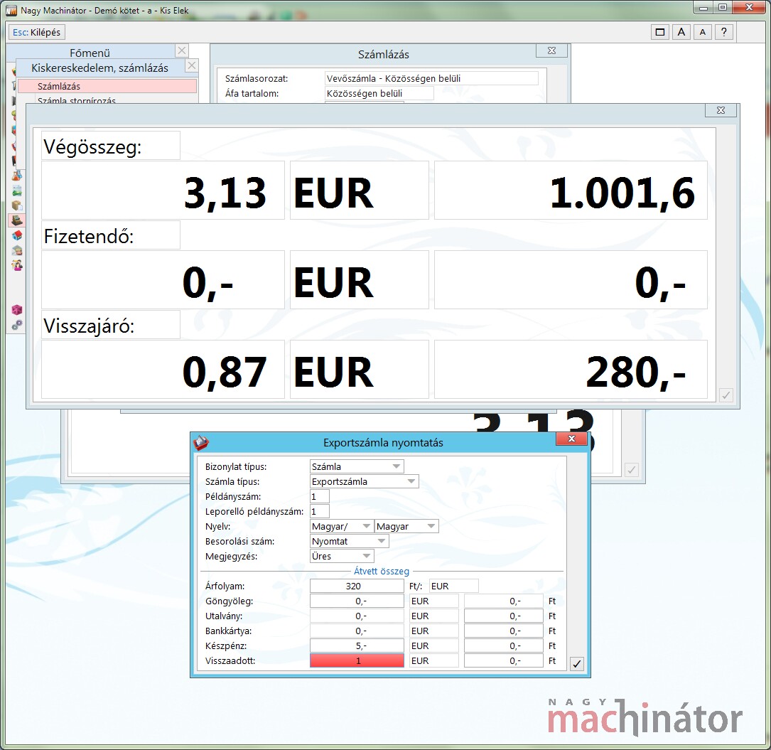 A fenti példában a vevő 3,13 EUR-os számlára átadott nekünk egy 5 EUR-t és visszaadtunk 1 EUR-t. Vagyis összesen 4 EUR-t kaptunk.