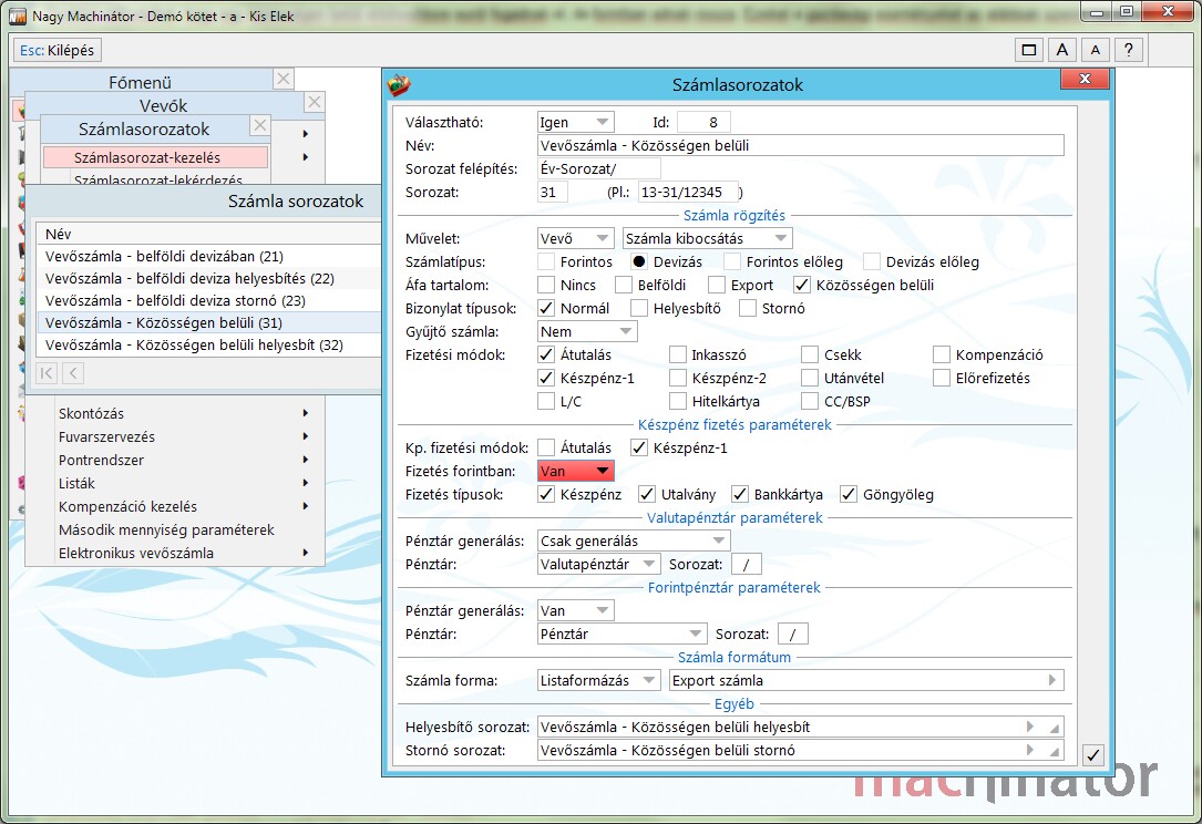 - A számlasorozatok funkcióban a Fizetés forintban mezőben lehet engedélyezni, hogy devizás számlára forintban is lehet fizetni.