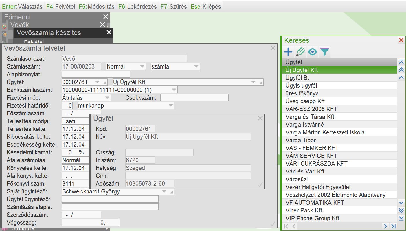 Az ügyfélnév mezőn F2-Funkció billentyű lenyomása után a keresett értéket be kell gépelni és a program automatikusan rá áll.
