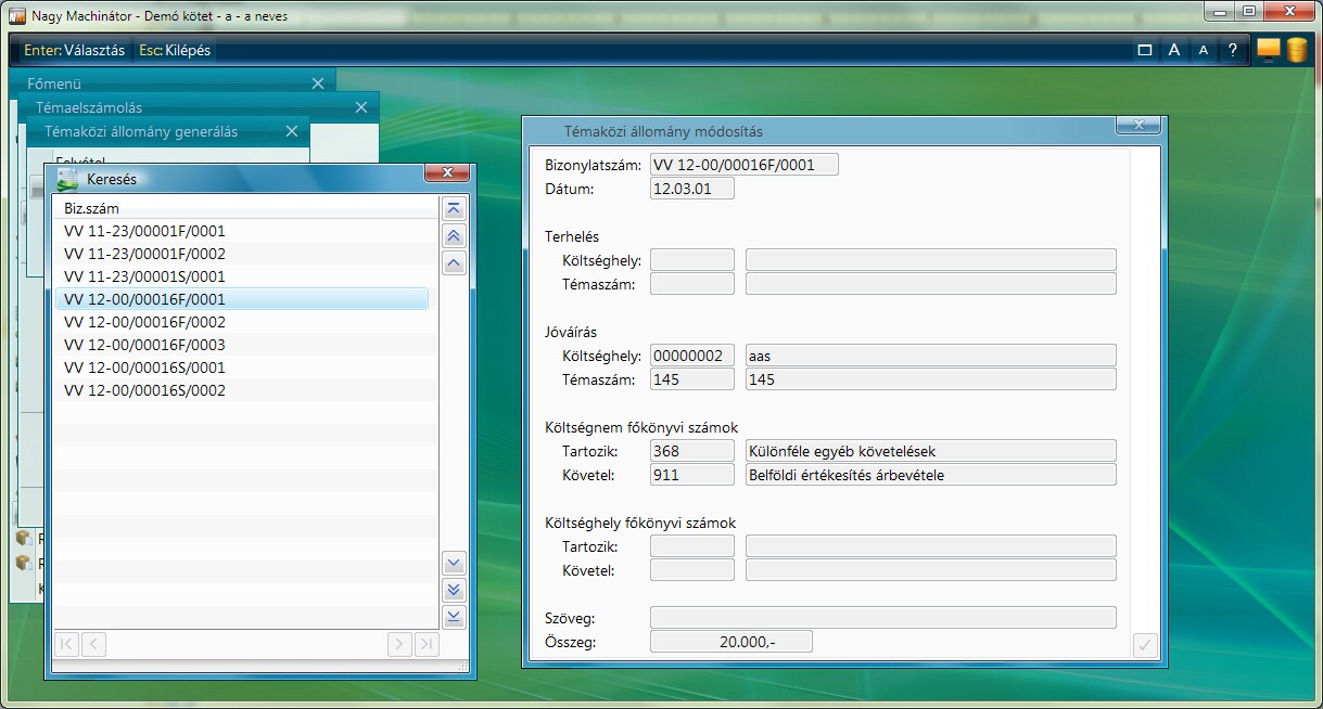 A funkció a számlában megadott költséghely/témaszámokra történő kontírozást figyelembe véve egy témaközi állományt generál. A témaközi állomány bizonylatszáma tartalmazza a következő információkat: modul betűjele, bizonylatszám, betűjel (S-Számlában megadott összeg, F-Felosztásban megadott összeg), sorszám (Pl: VV 11-00/00001S/0001)