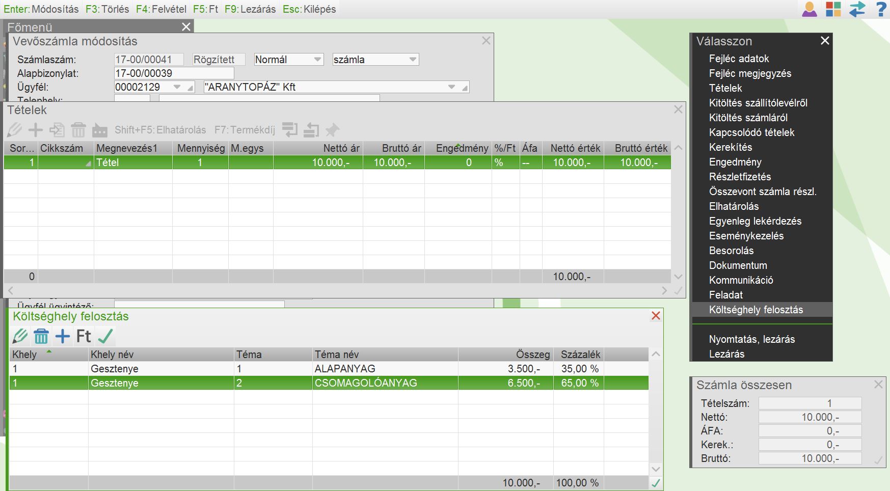 Pl.: Egy számla tartalmaz két tételt, de három költséghelyet terhel mindkét tétel. Ebben az esetben elég egyetlen költséghelyet megadni a számlában és a Költséghely felosztás funkcióban lehet az összeget felosztani.