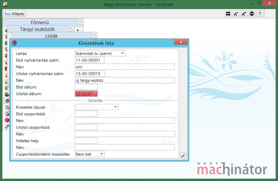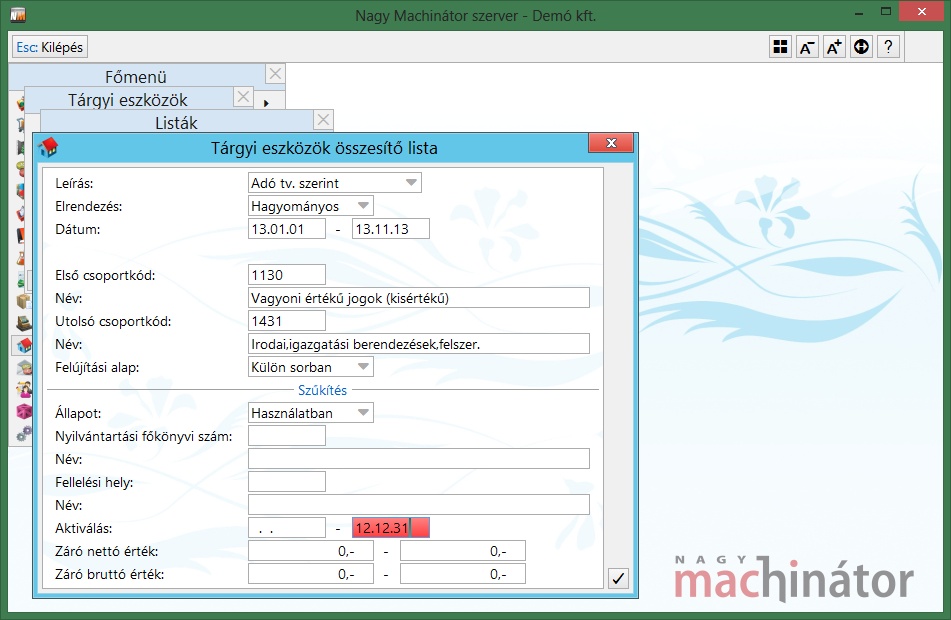 - Tárgyi eszközzel kapcsolatos listák, pl. adóalanyiság kezdetét megelőzően meglévő tárgyi eszközök adótörvény szerinti értékcsökkenése