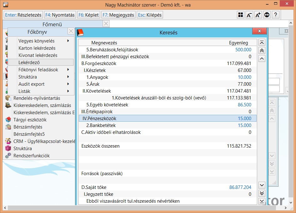 - A Számviteli törvény által előírt beszámolóhoz készült mérleg Pénzeszközök sora, a megfelelő időtartamokra való szűkítéssel