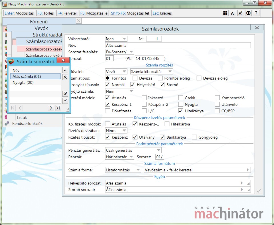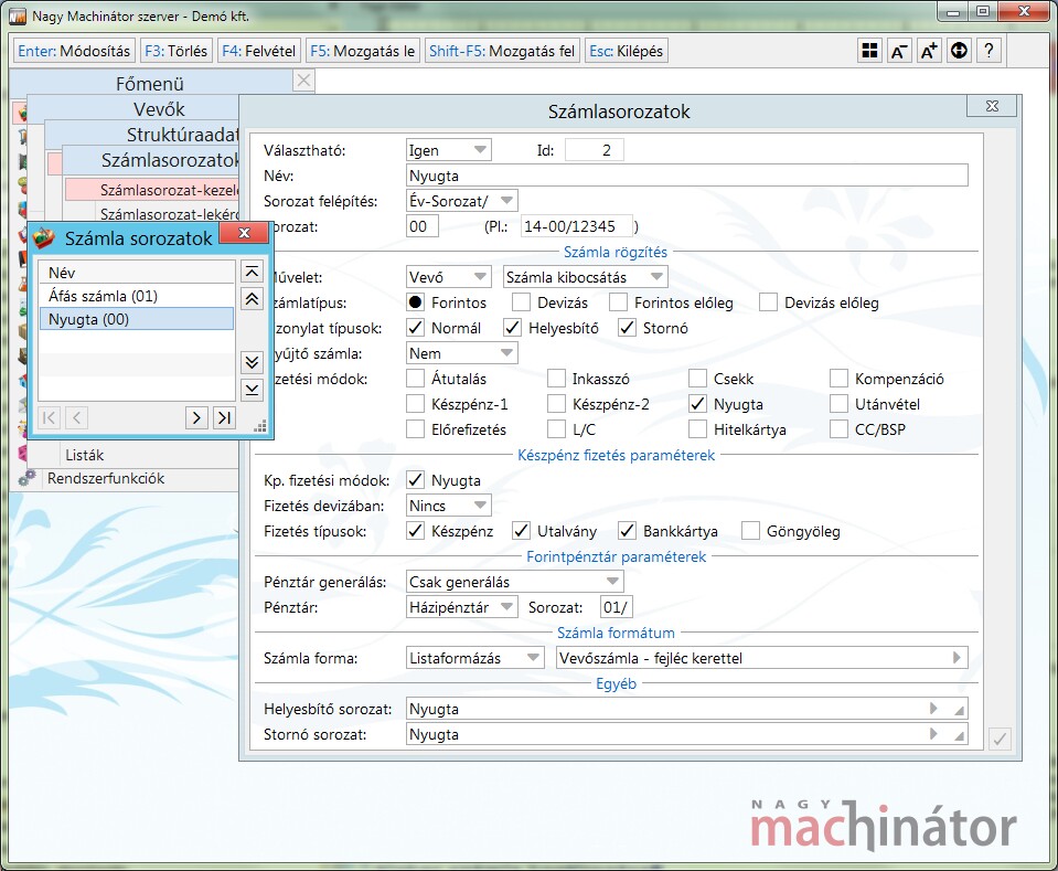 Külön sorozatszámot adhatunk meg az utalásos, csekkes, készpénzes, nyugtás számláknak, illetve azok stornó számlájának.