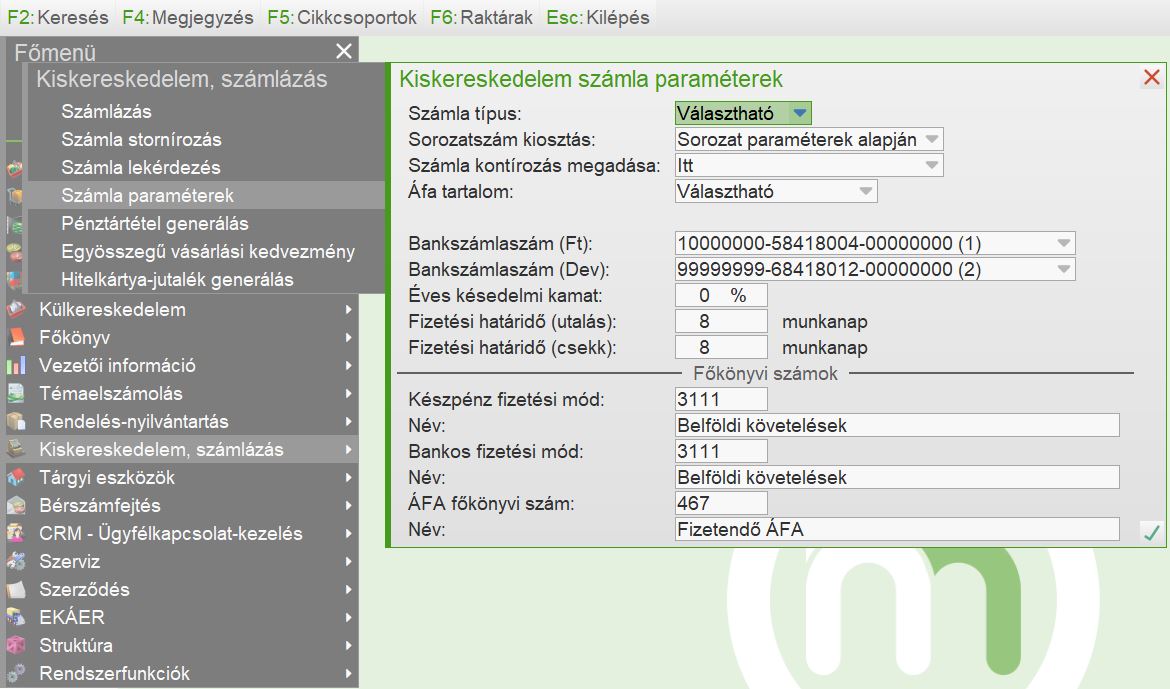Itt rögzíthetjük a kiskereskedelmi számla bevitel akcióval előállított számlák típusát hogy forintos vagy devizás legyen, sorozatszámait fizetési módonként, devizás típus esetén a tételek áfa tartalmát, a fizetési határidőt, a késedelmi kamatot, a számlák kontírozását illetve megadhatjuk, hogy mely raktárakból milyen mozgásnemmel milyen cikkcsoportok adhatók el.