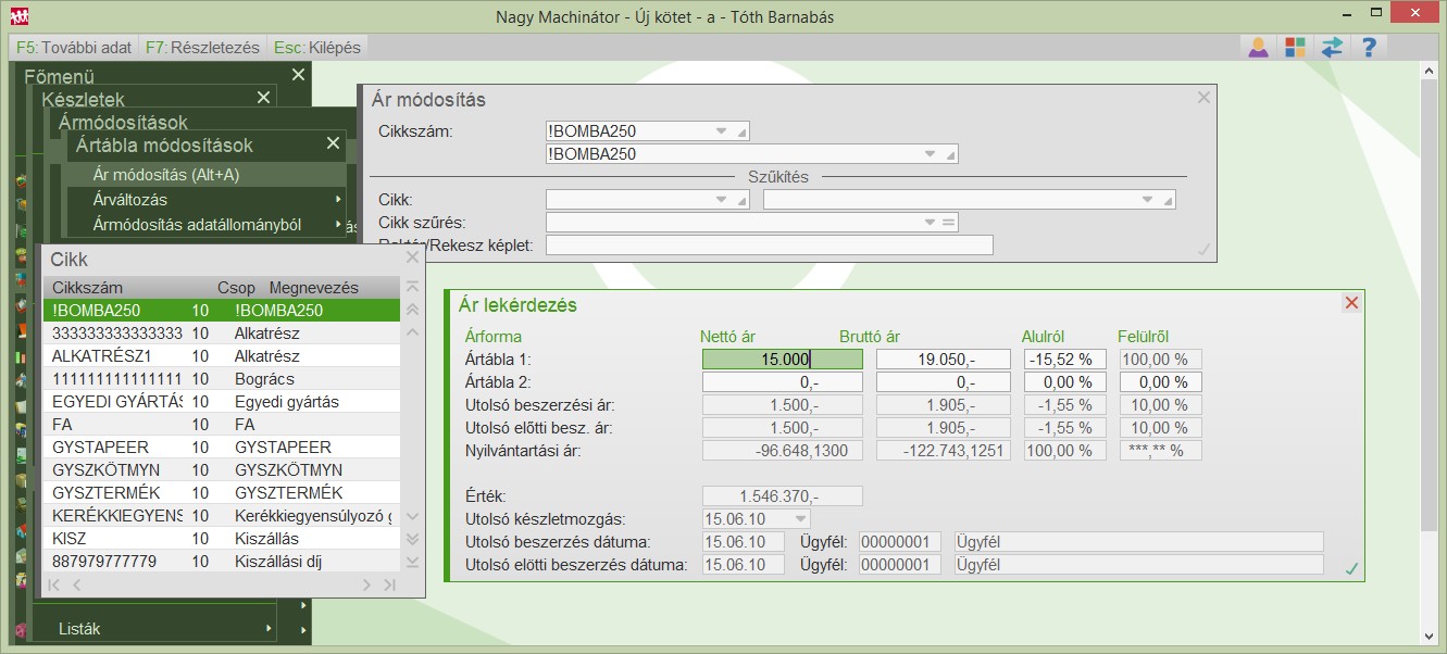 Amennyiben egy vagy több cikk árát ad hoc kell változtatni, a következő lehetőségek állnak rendelkezésre.