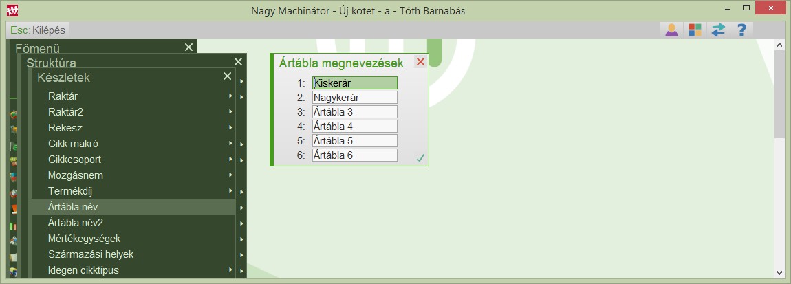 Az ártáblák elnevezése menüpontban lehet az ártáblák neveit meghatározni