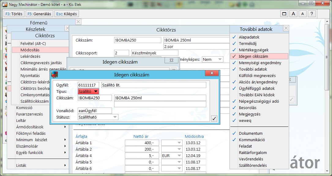 - Az idegen cikkszámokat az Idegencikkszám menedzser funkcióval is lehet módosítani.