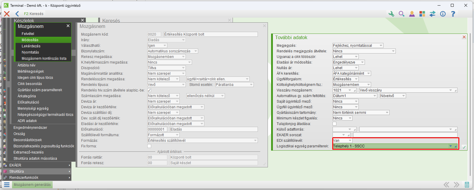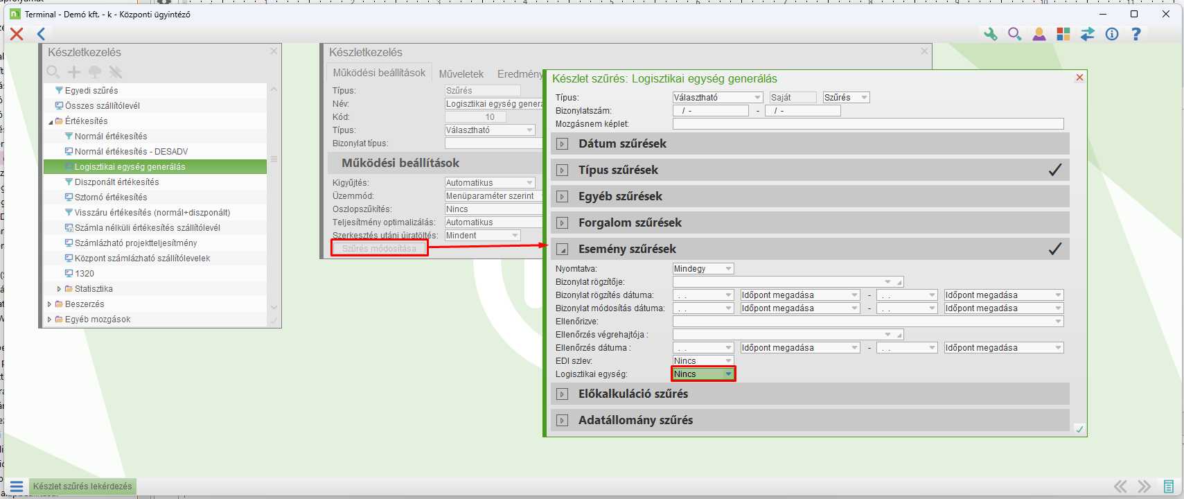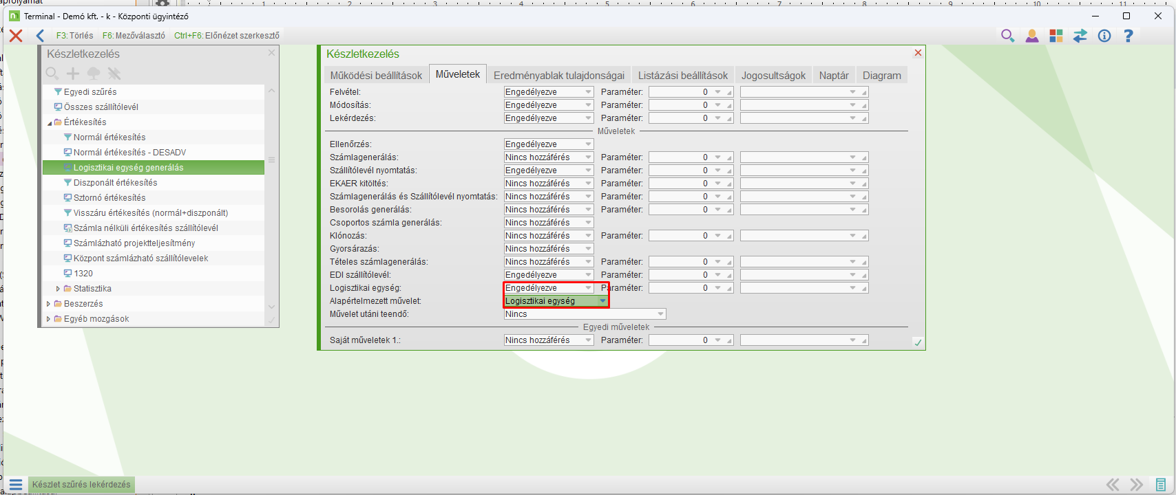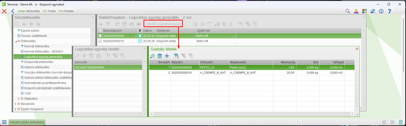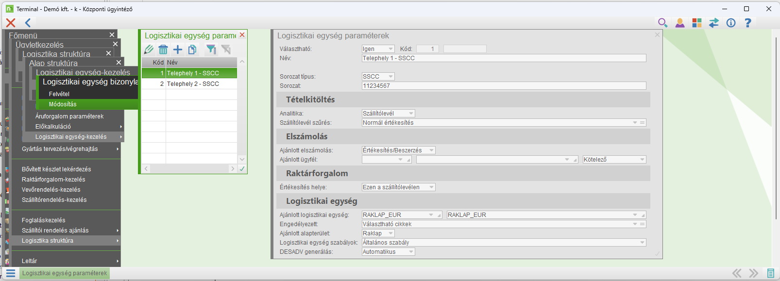 A Logisztikai egység-kezelés során a szállítólevelek fizikai tartalmát egyedi bizonylatszámmal ellátott logisztikai egységekhez (általában EUR raklapokhoz) lehet hozzárendelni. Az egyes bizonylatszámokon a program nyilván fogja tartani, hogy melyik vevőrendelés, mely tételei kerültek kiszállításra. A logisztikai egység generálás előfeltétele a DESADV generálásnak.-> Bővebben