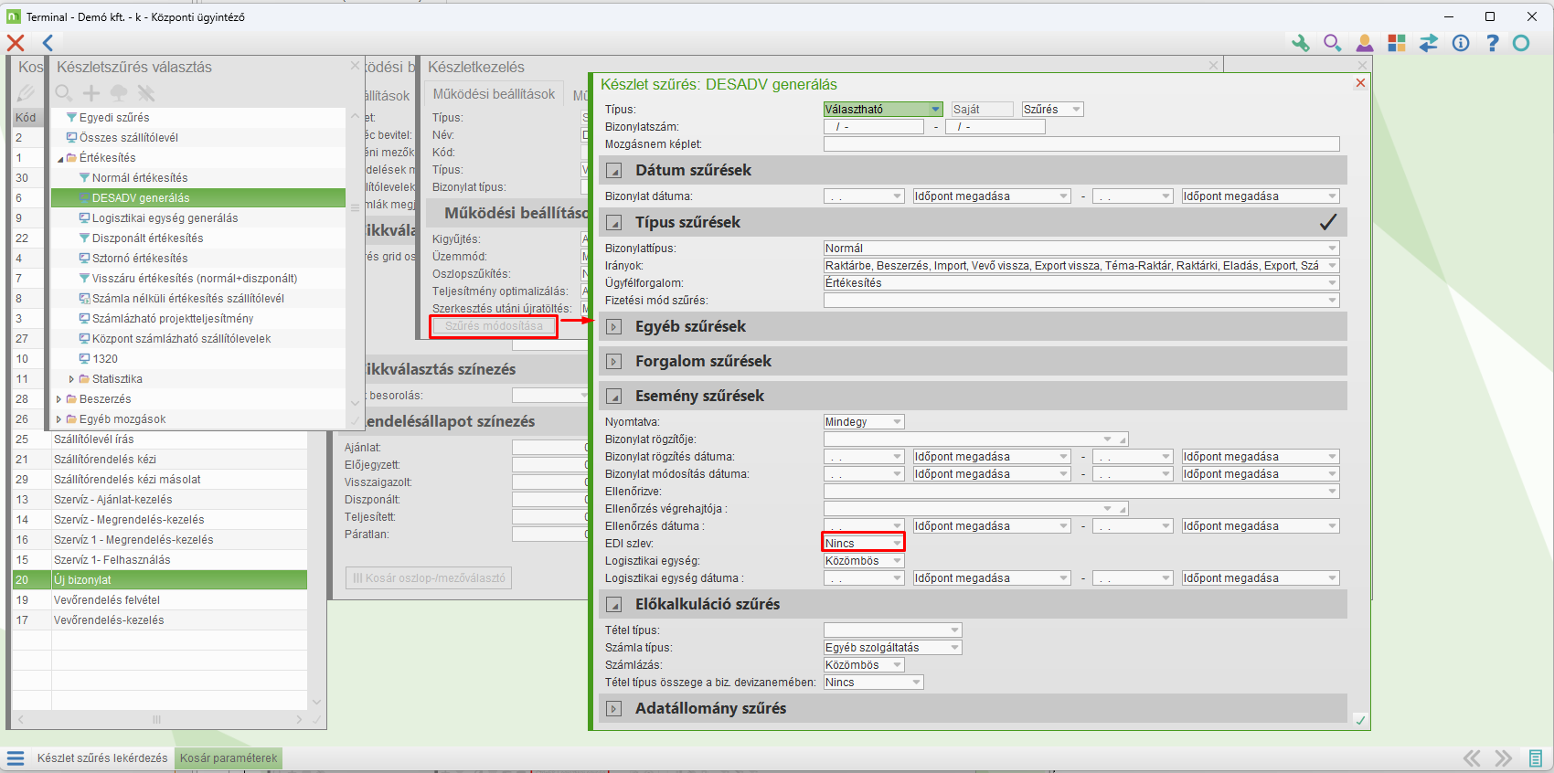 DESADV fájlok generálására is a szállítólevél szűrés funkciót kell használni. Szűrni azokra a szállítólevelekre érdemes, amelyek már logisztikai egységhez lettek rendelve, de ESADV még nem készült belőlük. A művelet indítása után szállítólevelenként elkészül a fájl.