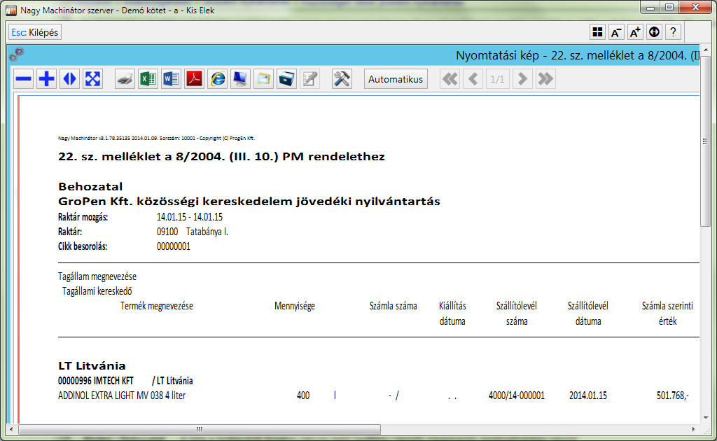 Az egyszerűsített kísérő okmány és a számla száma, kiállításának ideje. A Szállítólevél száma és annak dátuma kerül a listára a következő címkékkel: Szállítólevél száma, Szállítólevél dátuma Kapcsolódó paraméter: EKO |