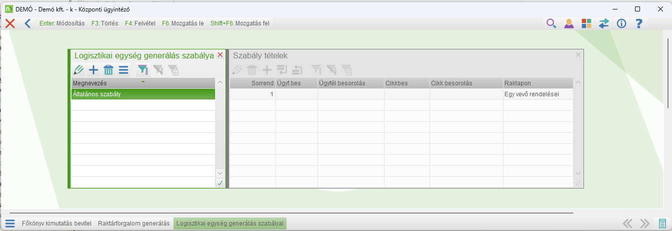 A Felrakandó tételek ablakból a kiválasztott tétel rá fog kerülni arra a raklapra, amelyik a Logisztikai egység bevitel ablakban ki van jelölve.
