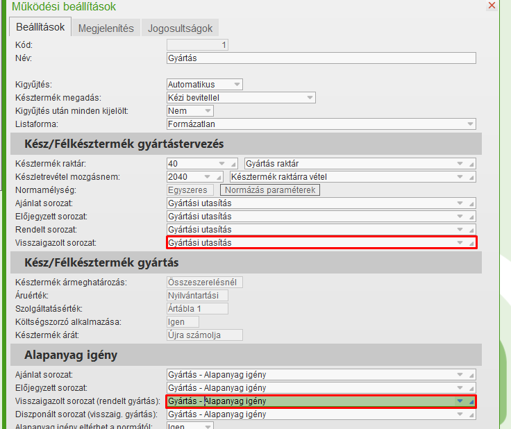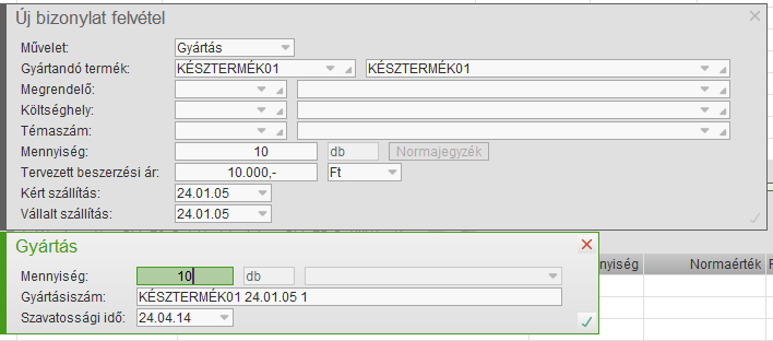 Amennyiben az adott gyártást más receptúra alapján akarják végrehajtani, de a gyári normajegyzéket nem akarják módosítani, nem a Gyártás műveletet kell alkalmazni, hanem a Visszaigazolás művelet. Ebben az esetben a tényleges Gyártás elindítása előtt lesz lehetőség az alapanyag igény módosítására.