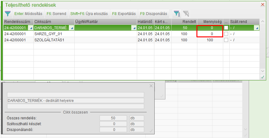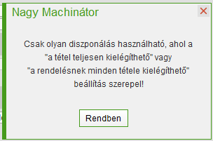 Egy tétel diszponálása csak akkor lesz végrehajtva, ha a teljes alapanyag igény lediszponálható. Rész diszponálás nem lehetséges.