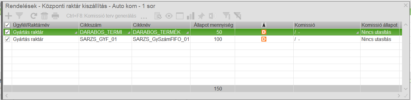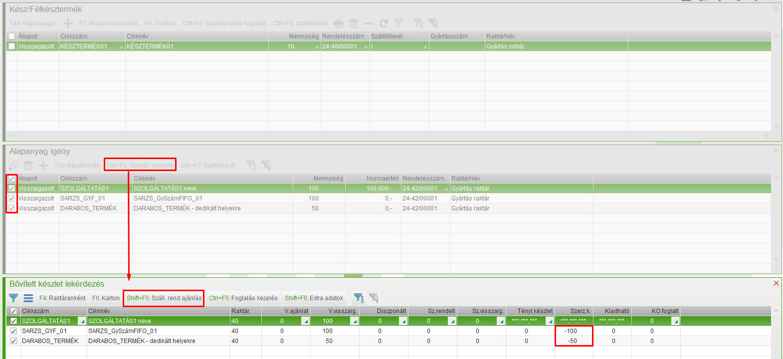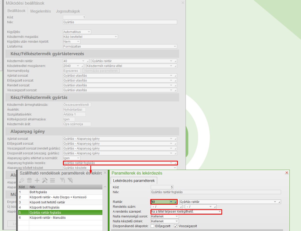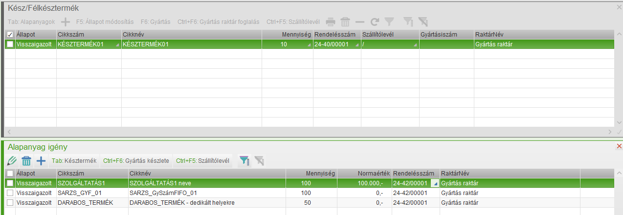 A helyes adathoz előbb el kel indítani a Gyártás raktár foglalás műveletet, amellyel a felhasználó eldöntheti, hogy melyik késztermékhez mennyi alapanyagot foglal le.