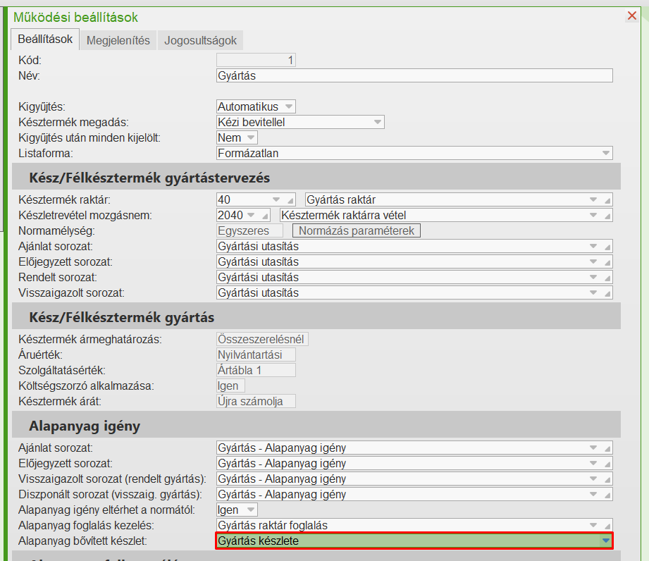 Amennyiben az alapanyagok esetleg félkészterméket tartalmaznak, amelyet egy külön gyártási folyamat részeként fognak legyártani, a Bont:Nem beállítást érdemes használni.