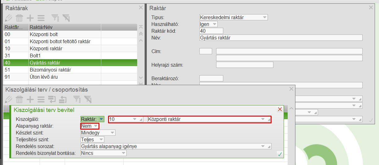 Az alapanyag igényt a Gyártás raktárra vonatkozó kiszolgálási terv alapján rendeli meg a program.