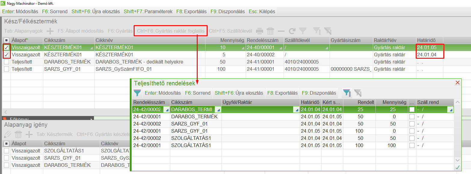 A program megmutatja, hogy a gyártáshoz szükséges alapanyag lefoglalható-e a gyártáshoz.
