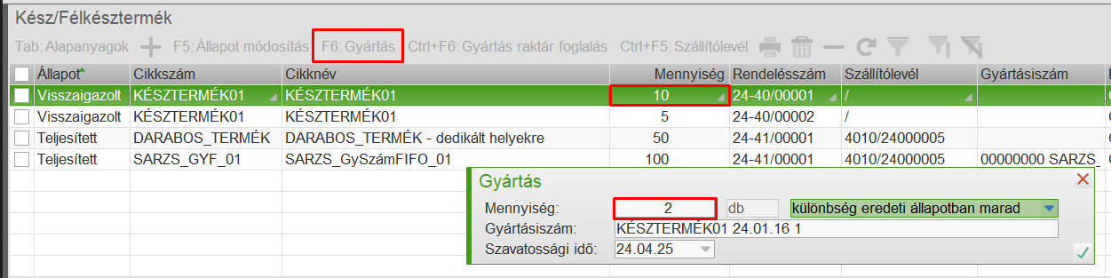 A program az eredeti gyártási utasításból leveszi (páratlan állapotra állítja) a most gyártandó mennyiséget és készít egy új gyártási utasítást a most gyártásba helyezett mennyiségre.