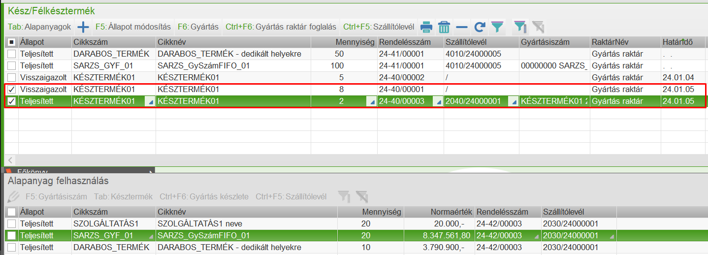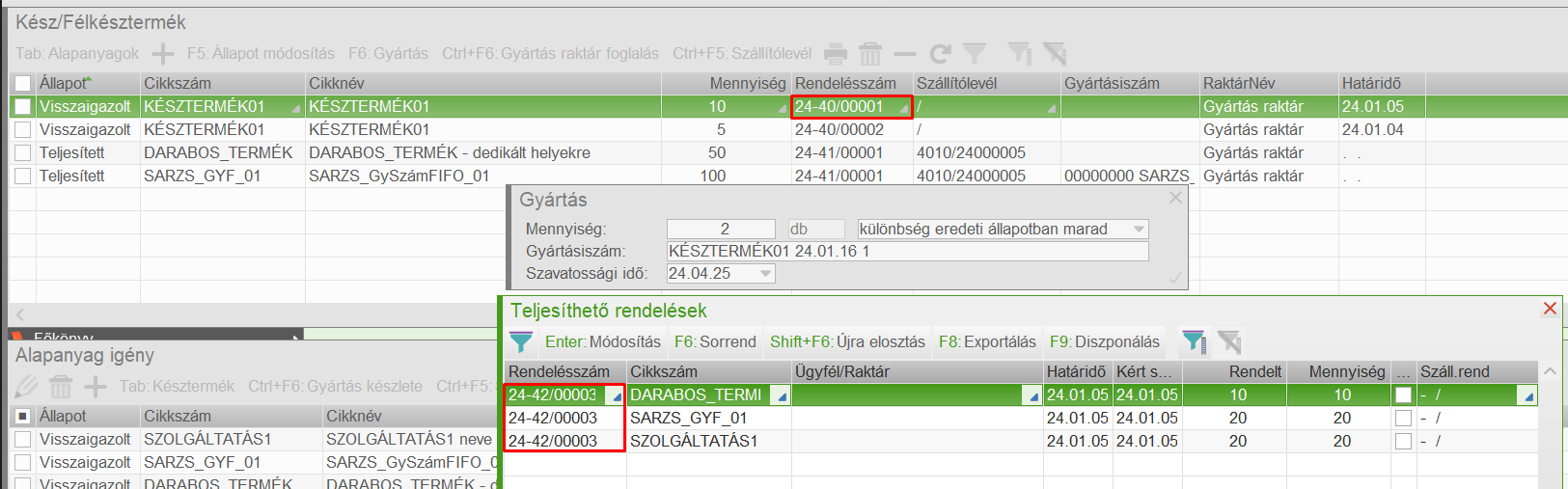 Az alábbi képen látható, hogy az eredeti Gyártási utasítás (10db-ra) a 24-40/00001 sorszámon volt, míg a már foglalásra kerülő rész gyártás utasítása (2 db-ra) a 24-40/00003 iktatószámon szerepel.