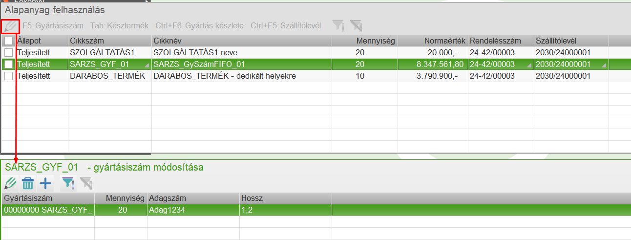 Az Alapanyag felhasználás ablakban a tétel kiválasztása után megjelenő Gyártási szám ablakban lehet módosítani a gyártási számokat.