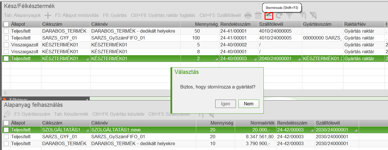 Amennyiben a módosítás által nyújtott lehetőségek nem elegendőek, lehetőség van a Gyártás művelet stornírozására.