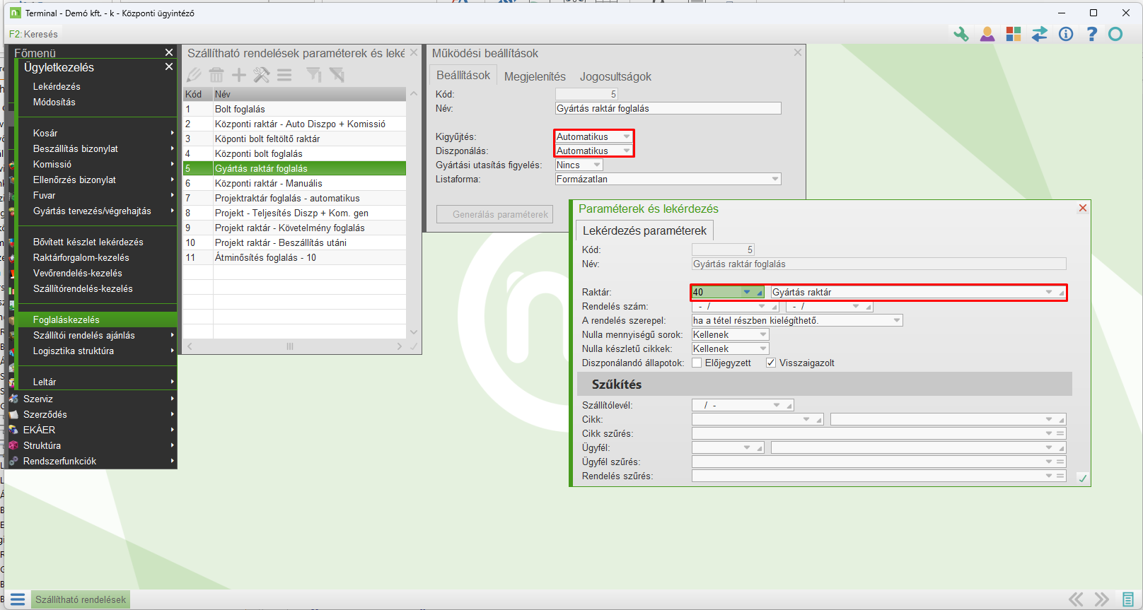 Igény esetén be lehet állítani, hogy amikor az áttárolási utasítás teljesül és legenerálódik a raktárközi szállítólevevél, akkor a cél raktárra (Gyártás raktár) vonatkozóan induljon el automatikusan a Foglaláskezelés.