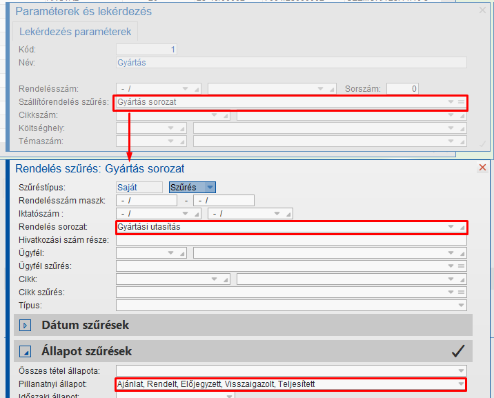 Az állapotszűrésnél abban az esetben érdemes Teljesített állapotot bepipálni, ha a legenerált gyártásokat lekérdezni, vagy módosítani akarják.