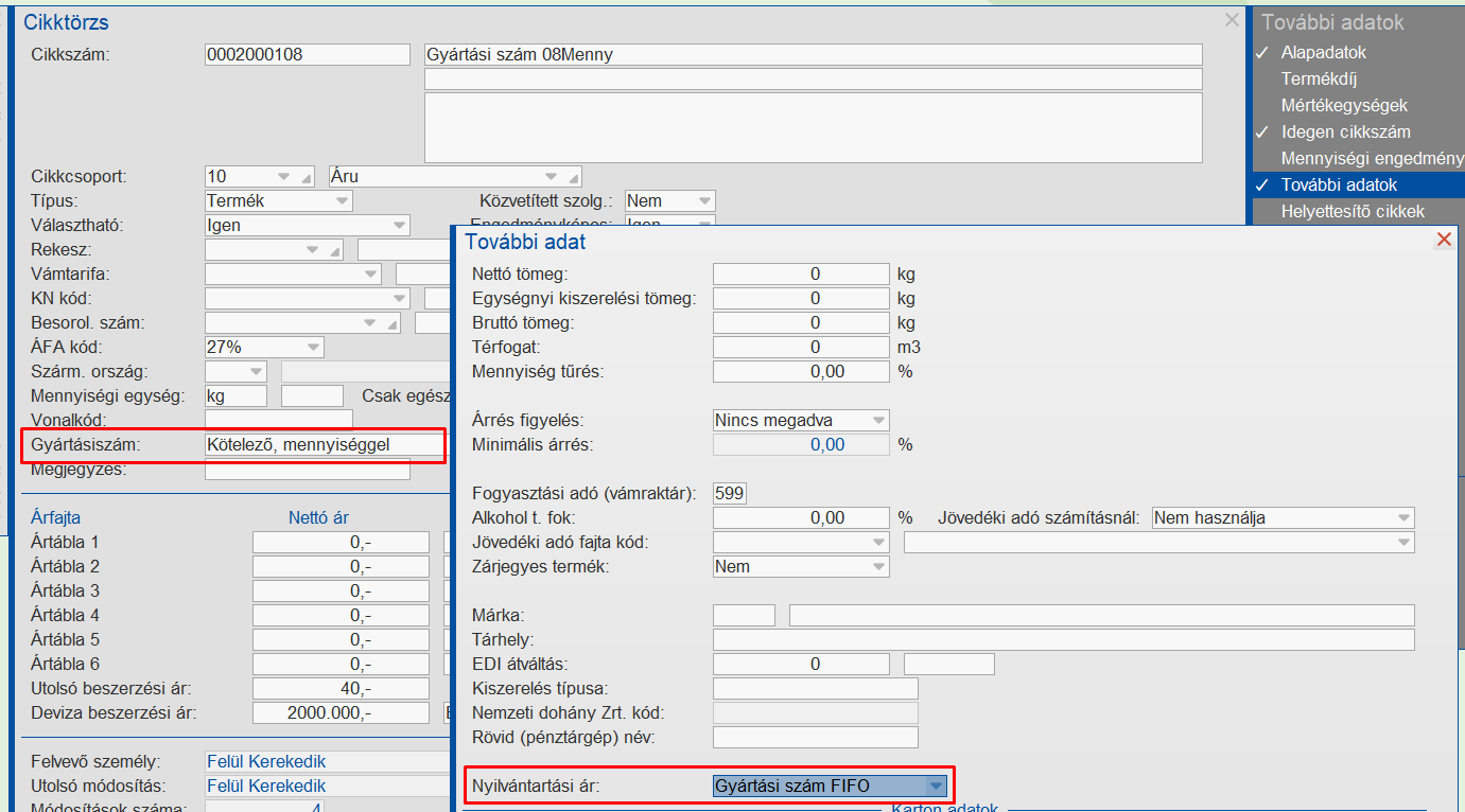 A Gyártási szám FIFO szerinti működést a Cikktörzs / További adatok menüpontban lehet aktiválni, abban az esetben, ha a Gyártási szám típusa Kötelező vagy Kötelező mennyiséggel értéken áll.