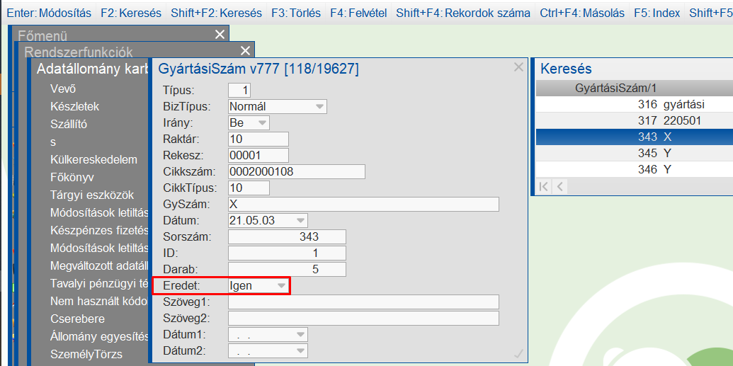- Adatállomány karbantartásban a GyártásiSzám állományban rá kell szűrni a Sorszám értékére, és