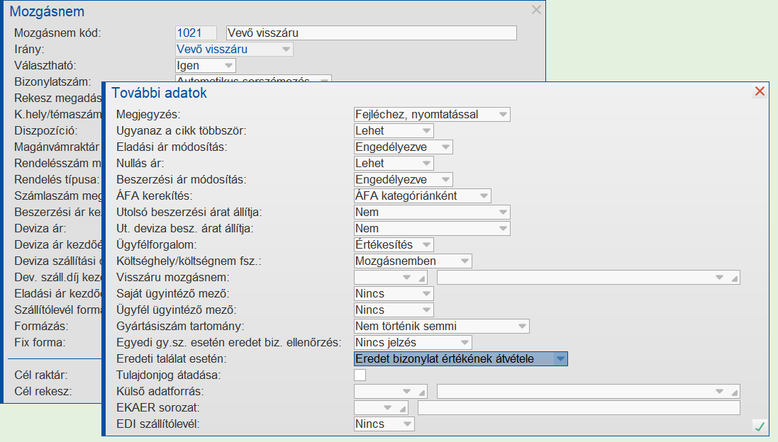 Amikor a vevő visszárut raktárra veszik a program egy ellenőrzést hajt végre a mozgásnem beállításai alapján és meghatározza a beszerzés értékét.
