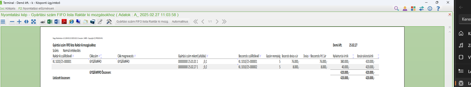 Megmutatja, hogy egy raktárforgalom ki mozgástételben milyen gyártási számok alapján lett a nyilvántartási érték kiszámolva.