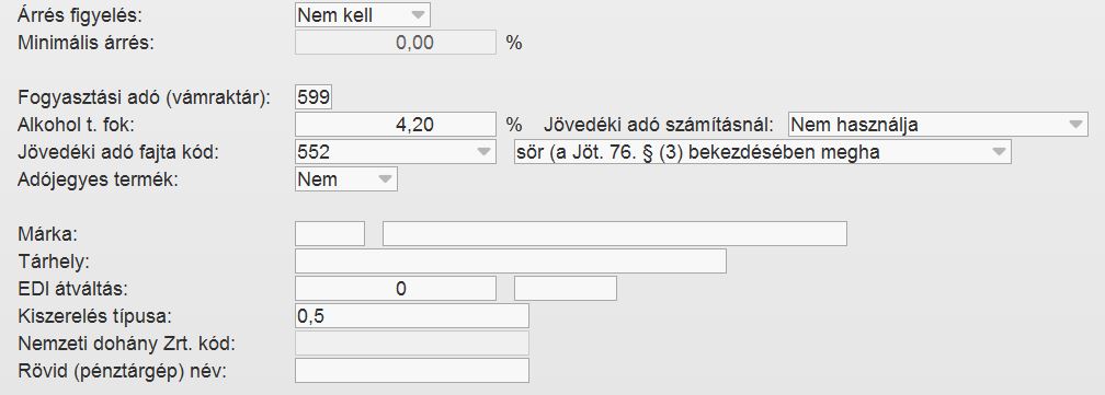 Alkoholtermék esetén a További adatokban rögzíteni kell a termék alkohol tartalmi fokát, valamint azt, hogy a Jövedéki adó törzsben beállított adó mértéke alkohol fokban számolódik-e. Szintén megadható, hogy számolás esetén átírható legyen-e a kiszámolt érték. Ezen kívül megadható a Fajta kód, mely akkor fontos, ha egy vámtarifaszámon belül fajtakódtól függően többféle jövedéki adó is lehet.