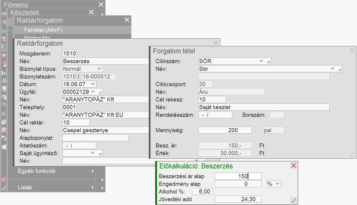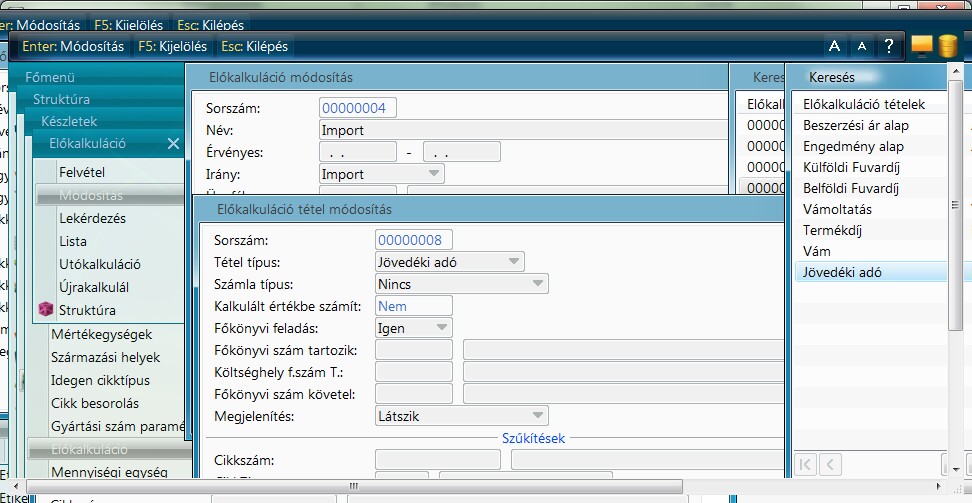 Az előkalkuláció modul a Jövedéki adó kiszámítását és tárolását a következő módon tudja végrehajtani.