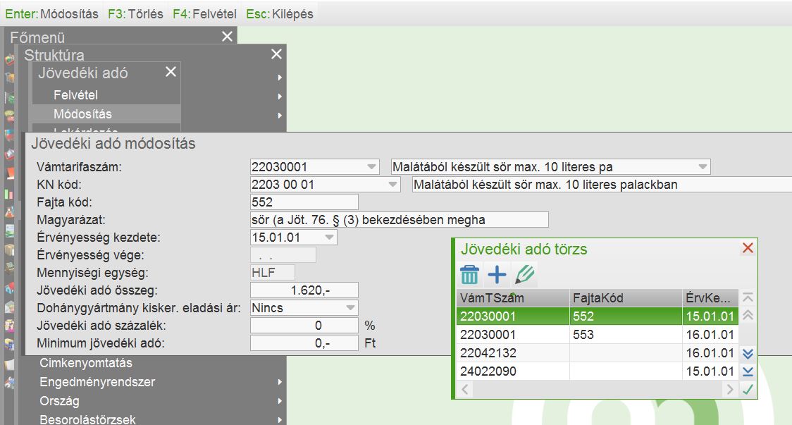 A jövedéki adó törzsbe vámtarifaszámonként lehet megadni a jövedéki adó mértékét.