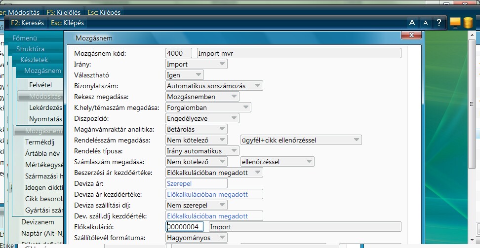 Ahhoz, hogy a raktárforgalom generálás megkérdezze a jövedéki adó mértékét, a mozgásnem paraméterek között az Előkalkuláció mezőben meg kell adni az előbb definiált előkalkuláció törzset.