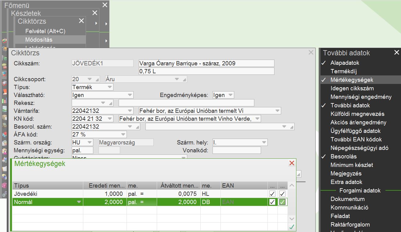 Pl. bor esetén a vámtarifaszám törzsben a Jövedéki mértékegység mezőben a "HL" (hektoliter) szerepel, míg a VNY mértékegység mezőben a "DB", a cikktörzsben a készletezési mértékegység palack és a palackban 0,75 liter fér el. Ekkor fel kell venni egy átváltást a palack és a hektoliter között (1/0,0075) és egy másikat a palack és a db között (1:1). Ez utóbbinál a program csak a 2/2 arányt fogadja el, mivel egy cikkre egy alapmértékegység/alapérték vonatkozásában csak egy sor hozható létre