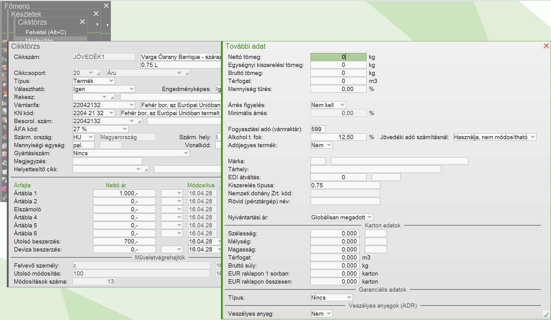 A Cikktörzsben jövedéki termék esetén kötelező kitölteni a További adatokban található Kiszerelés típusa, Alkohol fok és Adójegyes termék mezőket.