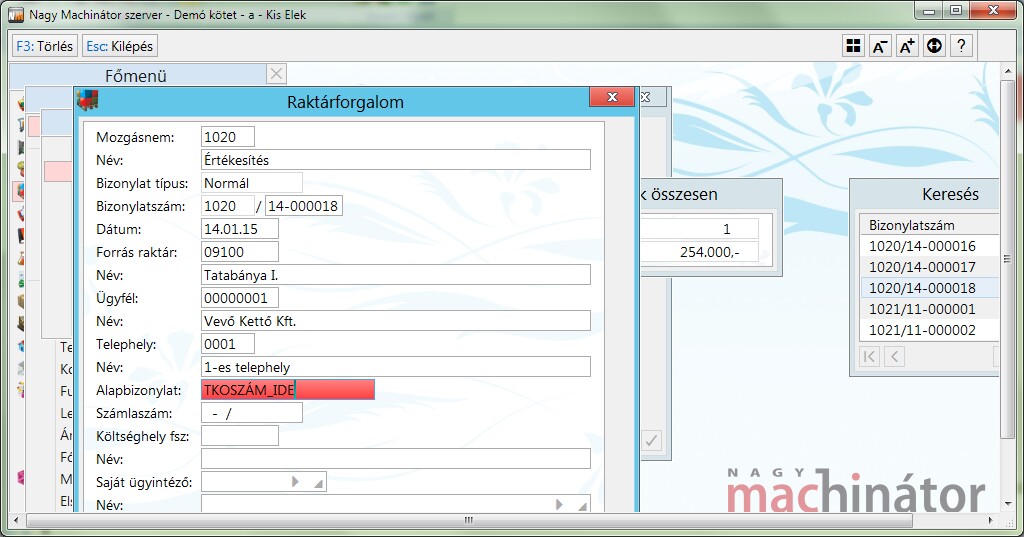 A raktárforgalom generálás során az Alapbizonylatszám mezőben kell megadni.