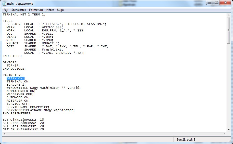 A Program szerverének munkakönyvtárában, az alkalmazott Windows operációs rendszer fájl-hozzáférés jogosultság rendszerének kihasználása mellett, az arra feljogosított felhasználó a main.cfg állomány szerkesztésével tudja a naplózást bekapcsolni. A PARAMETERS blokkba kell a következőt beírni: DIARY ON;