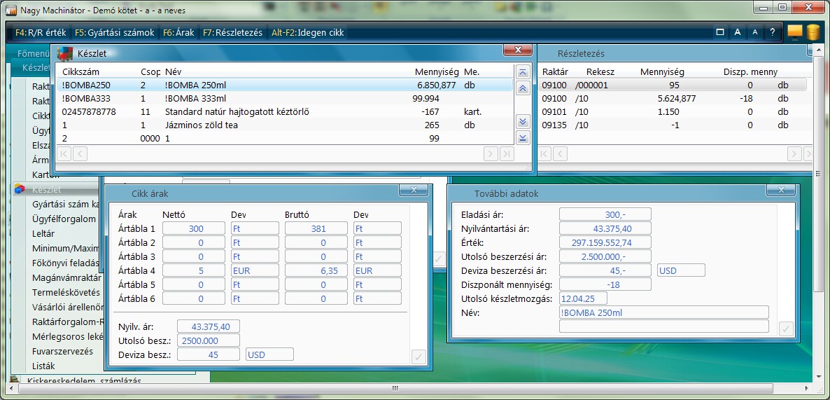 Az aktuális sorról további információként megjelenik az eladási ár, a nyilvántartási ár és érték, az esetleges diszponált mennyiség, az utolsó készletmozgás dátuma és a teljes cikknév.
