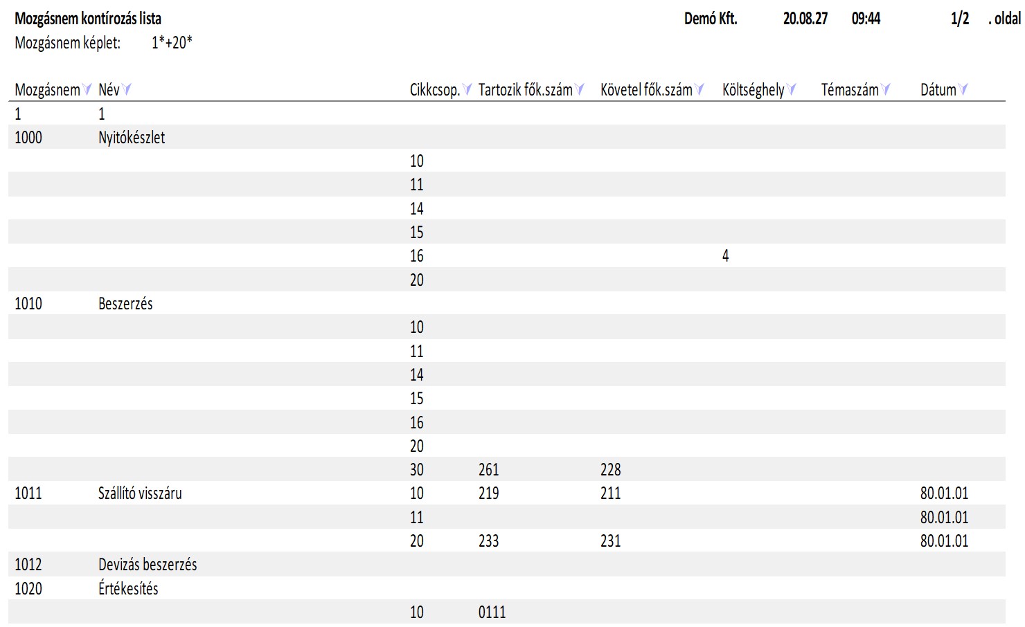 A lista a létező mozgásnemek kontírozásait mutatja meg. A lista szűkíthető egy mozgásnem képletre. Három alaplista készült el: Mozgásnem kontírozási lista, Kontírozatlan mozgásnemek, Részben kontírozott mozgásnemek.