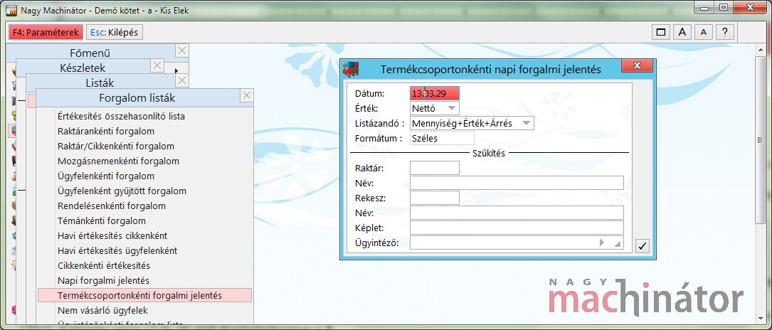 Az akció cikkcsoport képlet által meghatározott cikkek forgalmát összesíti egy-egy sorban a raktárforgalmi adatok alapján.