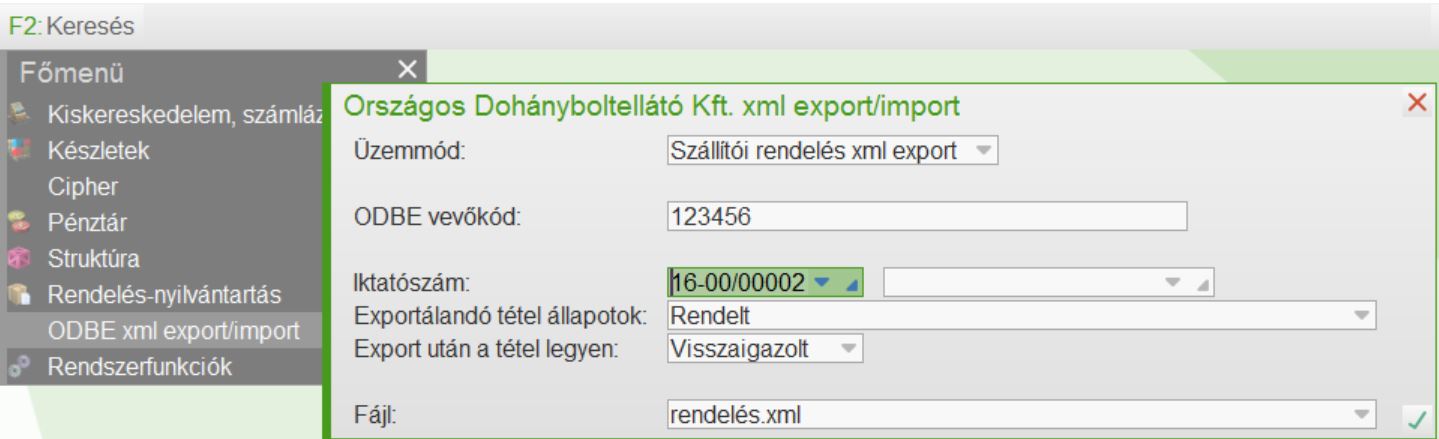 Meg kell adni a bolt ODBE vevőkódját, majd ki kell választani a küldendő rendelést. Az exportálható állapotok mezőben szűkíthetjük a küldendő tételek körét.