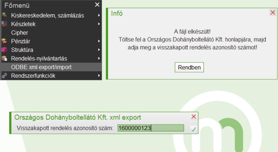 Visszaigazolt állapotba állítás esetén a Dohányboltellátó által visszaküldött rendelésszámot a program bekéri és "ODBE" előtaggal elhelyezi a rendelés Hivatkozási szám mezőjébe.
