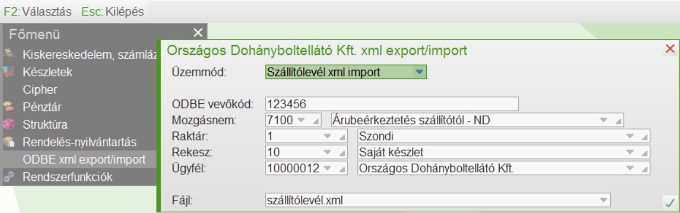 Az ODBE vevőkód után a bevételezés mozgásnemet (tipikusan 7100), a cél raktárt, ill. rekeszt és az ügyfelet kell megadni, majd kiválasztani a betöltendő fájlt.