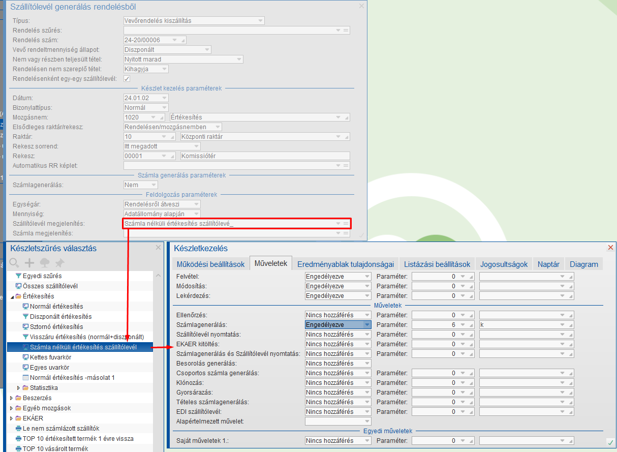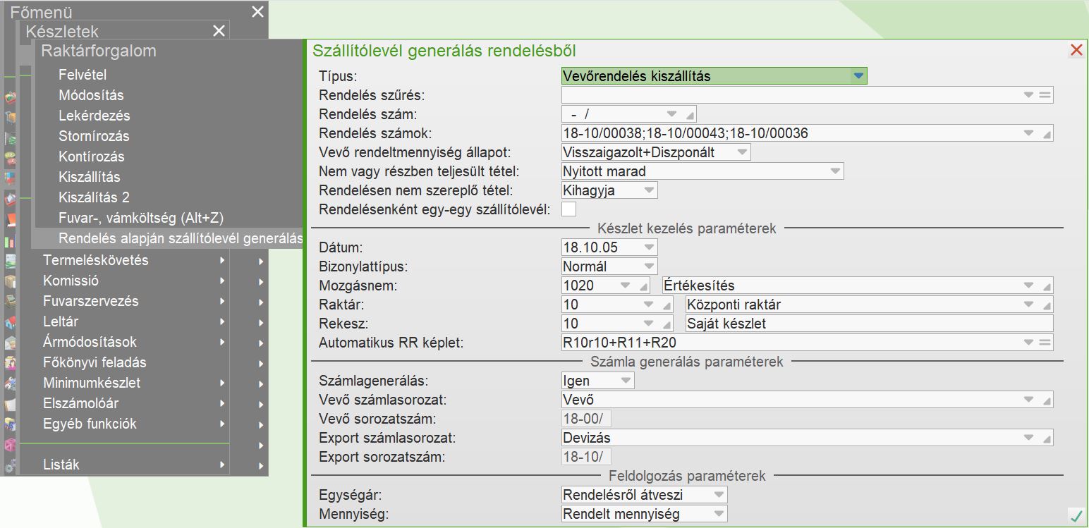 A funkció segítségével egy vagy több vevő vagy szállítórendelés alapján tudunk raktárforgalmi bizonylatot (szállítólevelet) generálni.